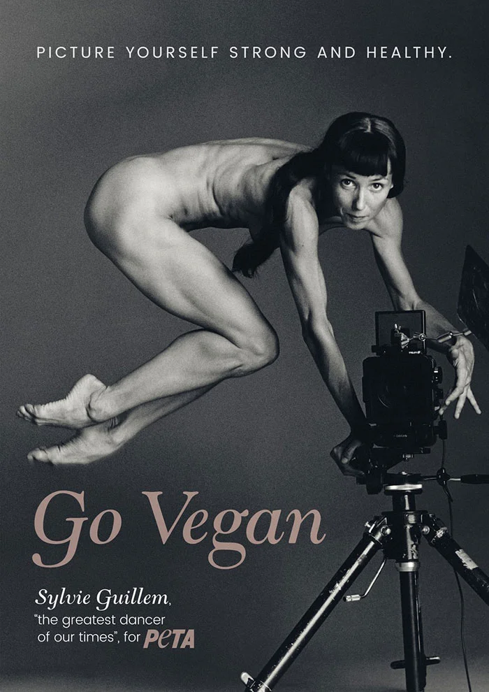 Francoska plesalka Sylvie Guillem je pozirala gola za zadnjo oglasno akcijo organizacije PETA (kratica za People for the Ethical Treatment of Animals), organizacijo aktivistov za pravice živali.