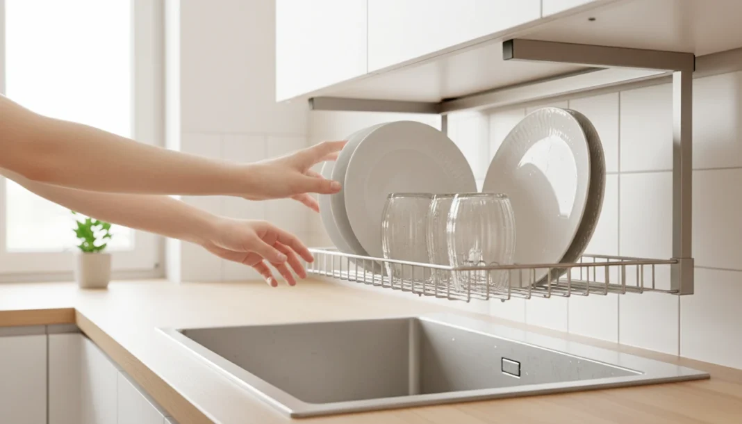 Klasična stojala za posodo imajo tri pogoste težave: zavzamejo dragocen del delovne površine, pod njimi se nabira voda in vodni kamen, poleg tega pa ustvarjajo občutek začasnosti – kot da kuhinja nikoli ni povsem pospravljena.