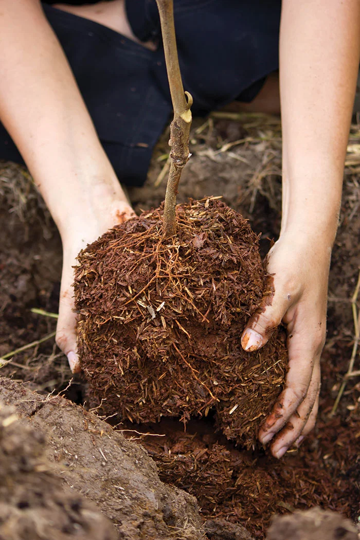Preden sadiko posadimo, ji odrežemo poškodovane dele korenin, močnejše korenine pa nekoliko prikrajšamo. Sadiko damo v sadilno jamo in korenine lepo razporedimo po dnu jame. Korenine prekrijemo z zemljo, ki smo ji dodali zrel kompost. Med prekrivanjem korenin sadiko rahlo tresemo, da se zemlja razporedi tudi med koreninami. Nato zemljo rahlo potlačimo.