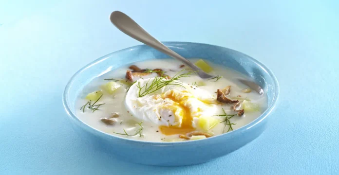 Juha iz krompirja, gob in kopra s poširanim jajcem